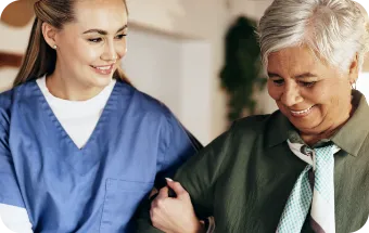 A smiling nurse assisting a smiling woman